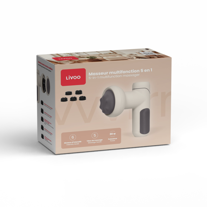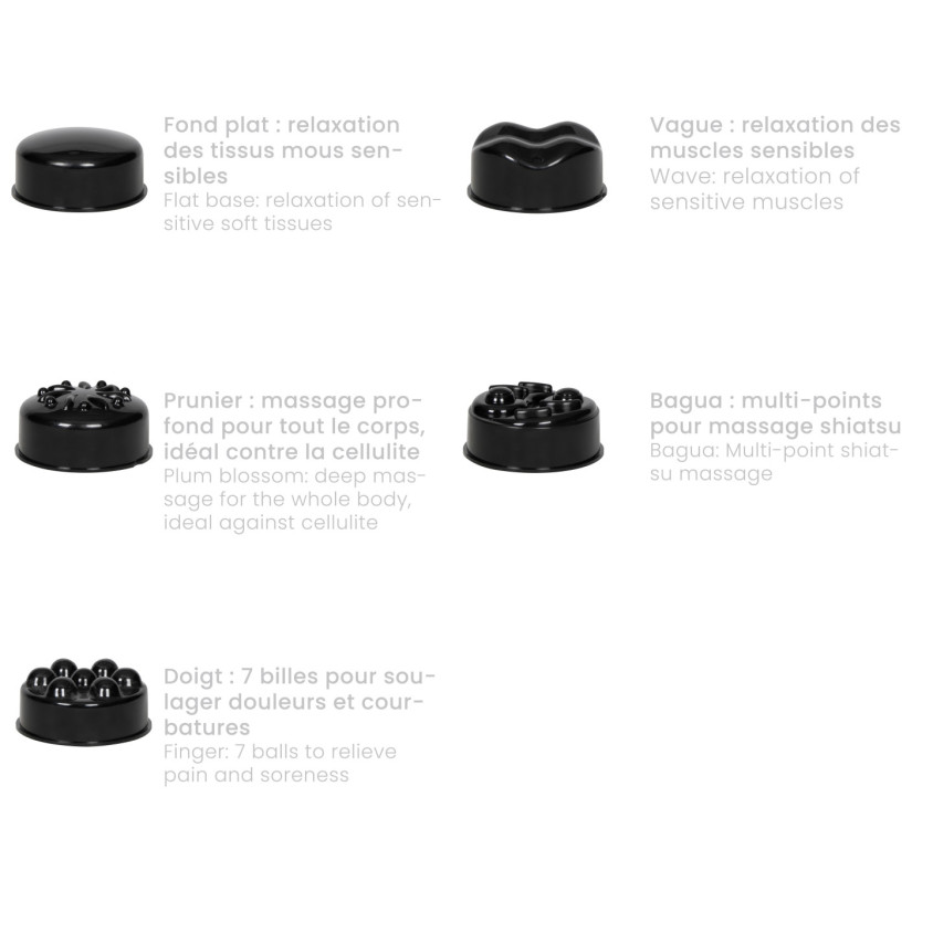 5 têtes de massage interchangeables pour les différentes parties du corps (bras, dos, hanches, cuisses, mollets)